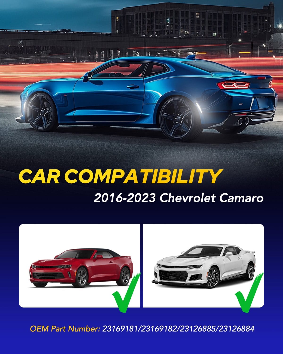 - 【Fitment】: AUTOONE front & rear LED side marker lights compatible with 2016-2021 Chevrolet Camaro, ensuring a perfect fit and seamless integration with your vehicle's body. Direct LED replacement for the side marker lights for Camaro, the OEM number: 23169181, 23169182, 23126885, 23126884.