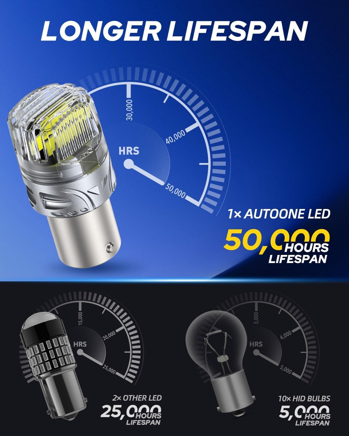 【Multi-Scenario Compatibility】: AUTOONE 1156 LED bulbs feature a non-polar design for plug-and-play use in factory reverse lights, brake lights, turn signals, and more. Compatible with BA15S 1156 7506 1003 1141 P21W 1073 1093 1129 1147 199 1159 1259 1295 1383 1459 1619 1651 1680 2056 3496 5007 5008 7008 7806 7527 1759 3497 and other specifications.