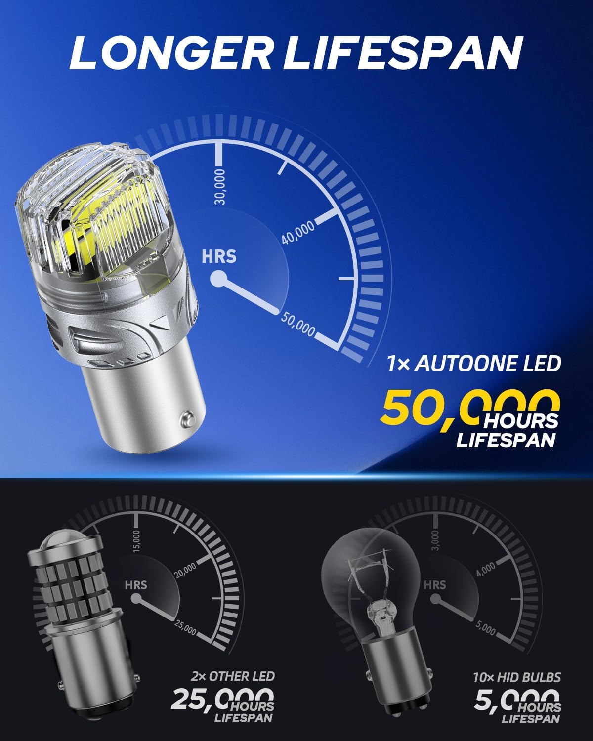 【Multi-Scenario Compatibility】: AUTOONE 1157 LED bulbs feature a non-polar design for plug-and-play use in factory reverse lights, brake lights, turn signals, and more. Compatible with BAY15D, 1016, 1034, 1157, 1157A, 1178A, 1196, 2057, 2057A, 2357, 2357A, and other specifications.